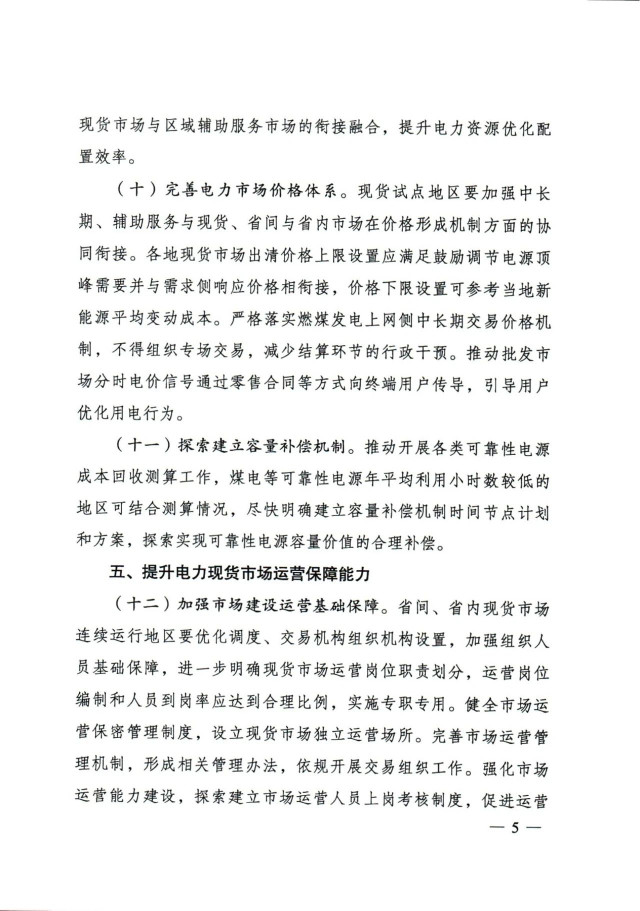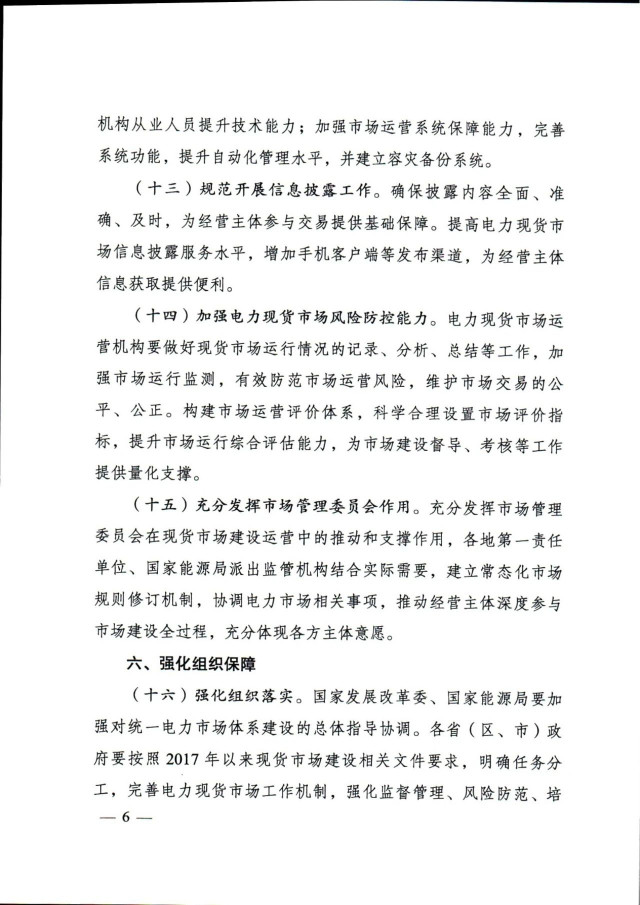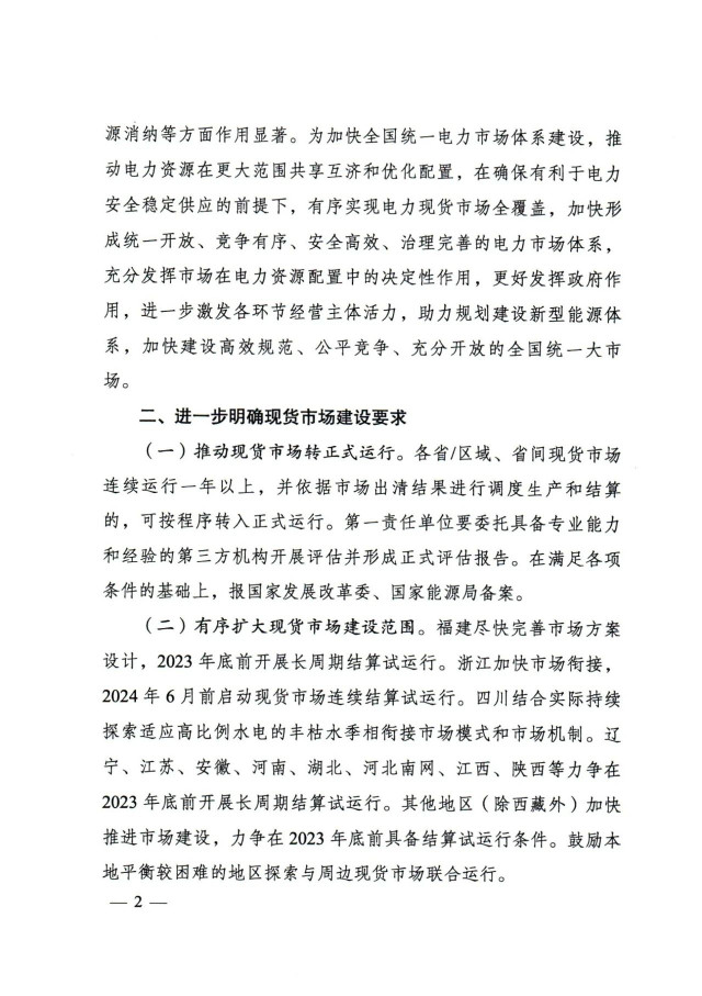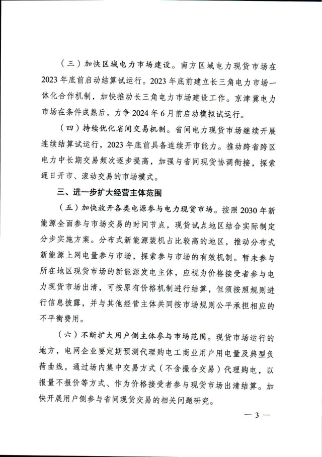 通知提出,加快放開各類電源參與電力現(xiàn)貨市場。按照2030年新能源全面參與市場交易的時(shí)間節(jié)點(diǎn),現(xiàn)貨試點(diǎn)地區(qū)結(jié)合實(shí)際制定分步實(shí)施方案。分布式新能源裝機(jī)占比較高的地區(qū),推動(dòng)分布式新能源上網(wǎng)電量參與市場,探索參與市場的有效機(jī)制。暫未參與所在地區(qū)現(xiàn)貨市場的新能源發(fā)電主體,應(yīng)視為價(jià)格接受者參與電力現(xiàn)貨市場出清,可按原有價(jià)格機(jī)制進(jìn)行結(jié)算,但須按照規(guī)則進(jìn)行信息披露,并與其他經(jīng)營主體共同按市場規(guī)則公平承擔(dān)相應(yīng)的不平衡費(fèi)用。