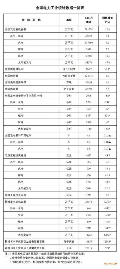 截至10月底,全國累計發(fā)電裝機容量約28.1億千瓦,同比增長12.6%。其中,太陽能發(fā)電裝機容量約5.4億千瓦,同比增長47.0%;風(fēng)電裝機容量約4.0億千瓦,同比增長15.6%。