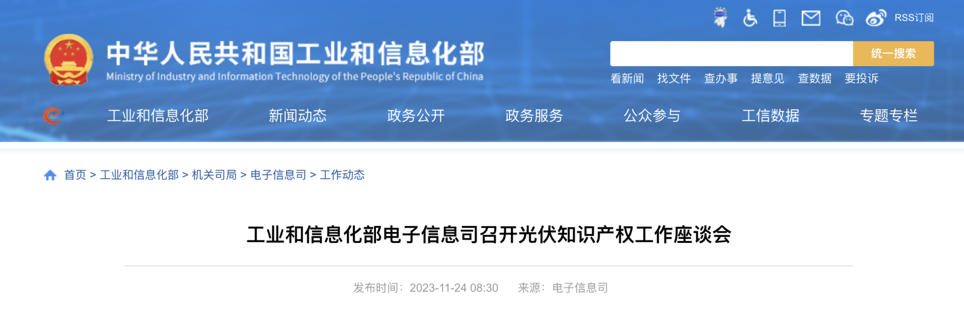 11 月 24 日,據(jù)工業(yè)和信息化部官網(wǎng)消息,近日工業(yè)和信息化部電子信息司在京召開光伏知識產(chǎn)權(quán)工作座談會,就開展光伏行業(yè)知識產(chǎn)權(quán)體系建設(shè),加強知識產(chǎn)權(quán)保護(hù)和成果轉(zhuǎn)化,促進(jìn)光伏產(chǎn)業(yè)持續(xù)創(chuàng)新發(fā)展,組織有關(guān)單位開展工作交流,并對下一步工作進(jìn)行部署。光伏領(lǐng)域部分骨干企業(yè)、行業(yè)協(xié)會、專利機構(gòu)、研究機構(gòu)、律師事務(wù)所等有關(guān)負(fù)責(zé)人參加會議。