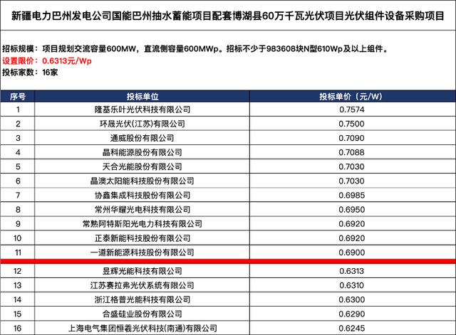 記者了解到,上述采購項目的投標企業(yè)共有16家,11家企業(yè)報出了高于或與0.69元/W持平的價格。其中,隆基綠能旗下的隆基樂葉給出了0.7574元/W的最高報價,一道新能的報價為0.69元/W,與協(xié)會最近一次發(fā)布的組件成本價一致。