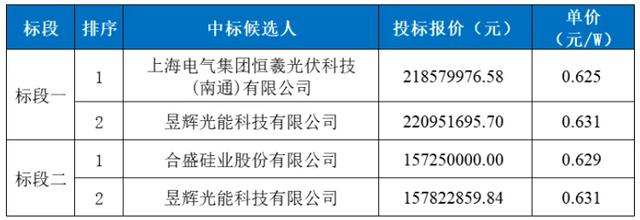 剩余5家企業(yè)報價則明顯低于光伏協(xié)會發(fā)布的組件成本價,報價范圍在0.6245元/W—0.6313元/W。上述采購項目兩個標段的中標候選人包括上海電氣集團恒羲光伏科技(南通)有限公司、昱輝光能科技有限公司以及合盛硅業(yè)。