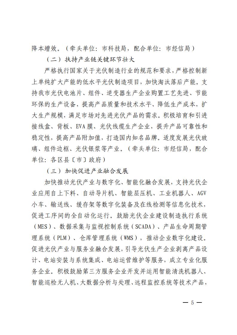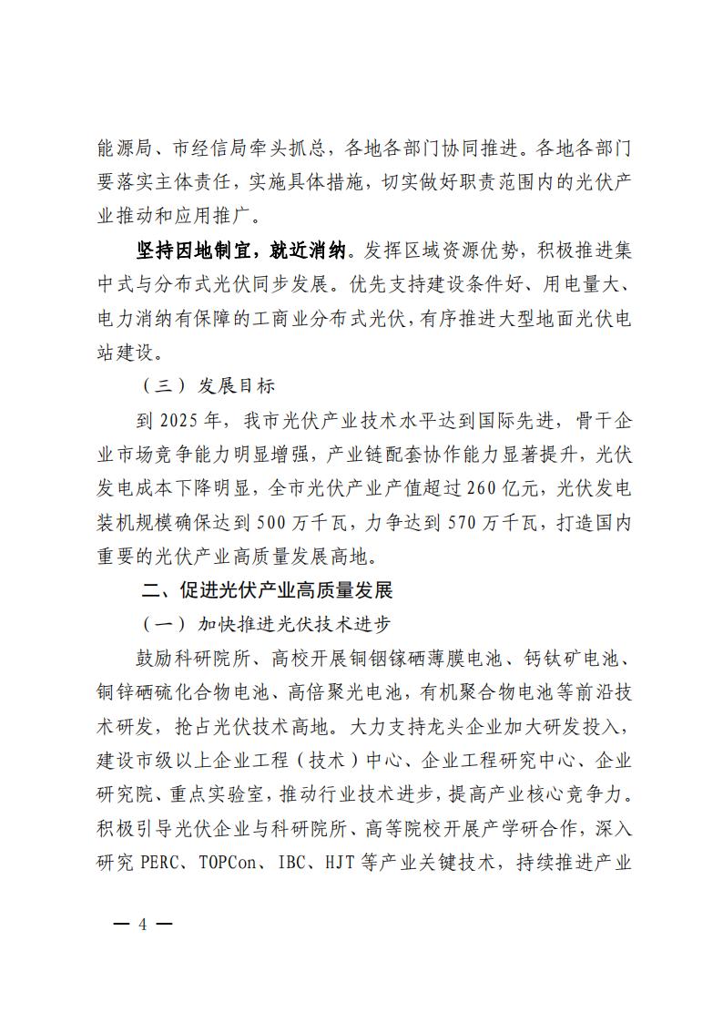 文件指出,到2025年,我市光伏產(chǎn)業(yè)技術(shù)水平達(dá)到國(guó)際先進(jìn),骨干企業(yè)市場(chǎng)競(jìng)爭(zhēng)能力明顯增強(qiáng),產(chǎn)業(yè)鏈配套協(xié)作能力顯著提升,光伏發(fā)電成本下降明顯,全市光伏產(chǎn)業(yè)產(chǎn)值超過(guò)260億元,光伏發(fā)電裝機(jī)規(guī)模確保達(dá)到500萬(wàn)千瓦,力爭(zhēng)達(dá)到570萬(wàn)千瓦,打造國(guó)內(nèi)重要的光伏產(chǎn)業(yè)高質(zhì)量發(fā)展高地。