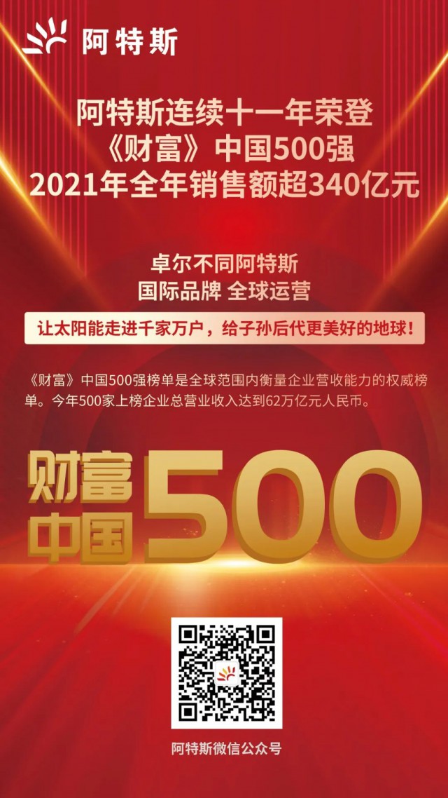 7月12日,財富中文網(wǎng)發(fā)布2022年《財富》中國500強排行榜,阿特斯陽光電力集團憑借2021年340億元營收再次榮登榜單。這是阿特斯集團連續(xù)第十一年上榜,充分彰顯了公司高質(zhì)量可持續(xù)發(fā)展的澎湃動力。