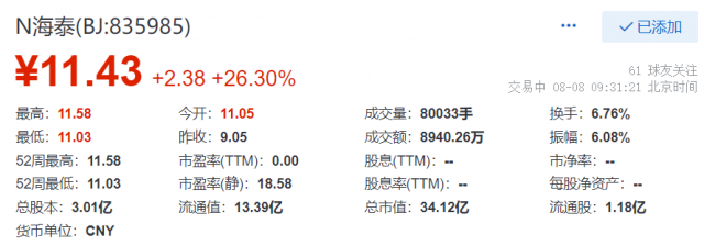 8月8日,唐山海泰新能科技股份有限公司(證券簡稱:“海泰新能”,證券代碼:“835985”)正式敲鐘,登陸北京證券交易所,發(fā)行價9.05元。截至發(fā)稿,其股價達(dá)到11.43元,漲幅為26.30%,總市值超34億元。