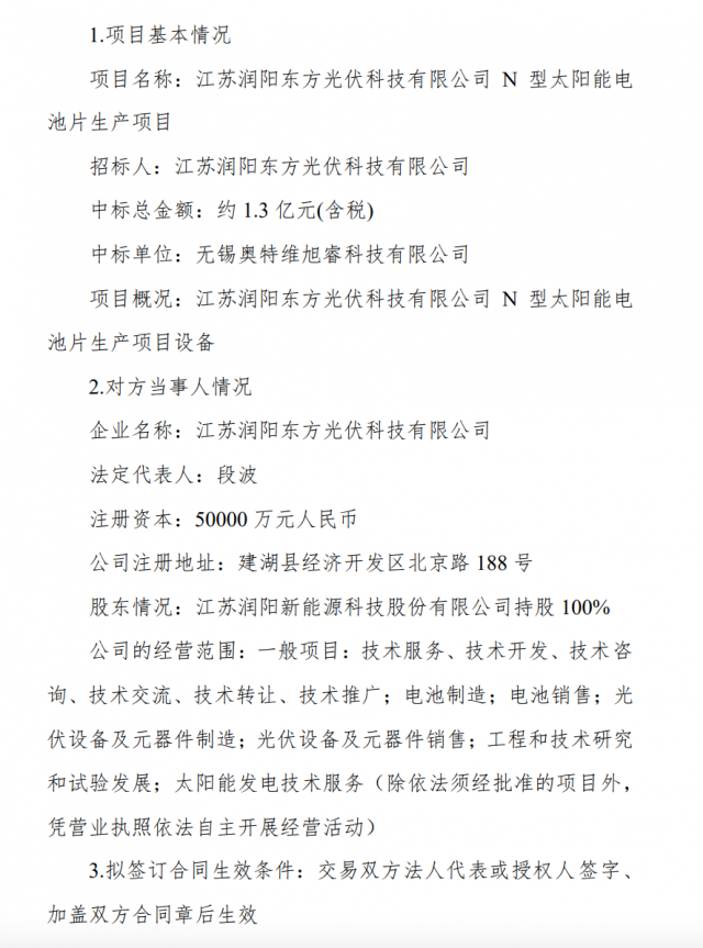 奧特維公司控股子公司中標(biāo)潤陽東方光伏科技N型電池片生產(chǎn)項(xiàng)目,中標(biāo)金額約1.3億元。