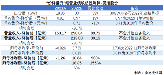首先來(lái)看愛旭股份,假設(shè)2022年電池片單W售價(jià)下降至2020年的水平,同時(shí)盈利能力恢復(fù)至同期水平,按照全年出貨30GW計(jì)算,則營(yíng)收規(guī)模相比于降價(jià)前下降27%,營(yíng)收增速由89.7%下降至39.1%。不過,受益于盈利能力的修復(fù),經(jīng)營(yíng)業(yè)績(jī)暴增1556%,相較于降價(jià)前的960%大幅提升。