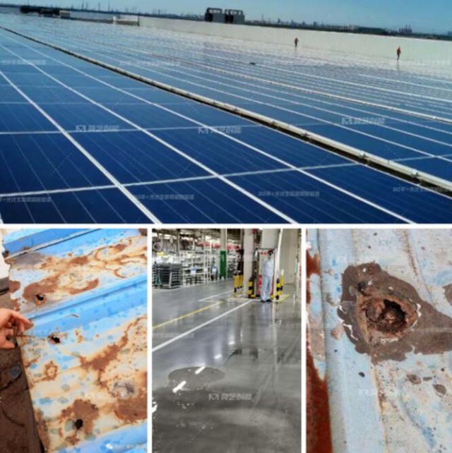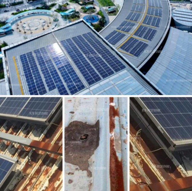 若只依靠彩鋼瓦本身的屋面,很容易因?yàn)橥繉雍穸炔粔?,加之紫外線、雨水、光合作用等自然因素的侵蝕,造成屋面彩鋼瓦接縫處開(kāi)裂、鉚釘松動(dòng)生銹、屋面銹蝕擴(kuò)大、瓦脊銹蝕銹穿導(dǎo)致屋面出現(xiàn)滲水漏水的情況。同時(shí)因其坡度小,可能會(huì)造成雨水排泄不暢、積水超過(guò)彩鋼瓦接縫高度或鉚釘孔高度及溝沿瓦而導(dǎo)致銹損滲漏。而工廠生產(chǎn)過(guò)程中排放的酸性、堿性等氣體長(zhǎng)期與屋面接觸,也會(huì)腐蝕鋼結(jié)構(gòu),加速銹蝕、穿孔導(dǎo)致滲漏。
