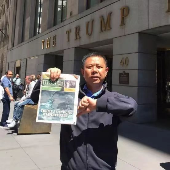 2017年,在特朗普宣布退出巴黎氣候協(xié)定的第二天,憤怒的高紀(jì)凡便一個(gè)人跑到紐約特朗普大廈門前,右手拿著剛剛印出來(lái)的報(bào)紙,左手大拇指朝下,抗議的同時(shí)還不忘招賢納士:歡迎全球致力于低碳技術(shù)創(chuàng)新的人到中國(guó)發(fā)展。