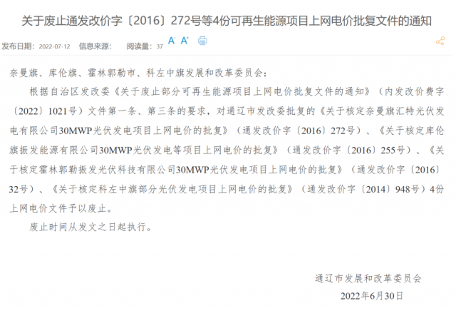 此前,太極實(shí)業(yè)(600667)8月4日晚間公告,公司關(guān)注到內(nèi)蒙古發(fā)改委官網(wǎng)刊登的《關(guān)于廢止部分可再生能源項(xiàng)目上網(wǎng)電價(jià)批復(fù)文件的通知》,涉及子公司五個(gè)集中式光伏電站;所涉電站將不再享受電費(fèi)補(bǔ)貼,公司將對(duì)所涉電站評(píng)估后計(jì)提固定資產(chǎn)減值準(zhǔn)備,初步測(cè)算固定資產(chǎn)減值金額為3.28億元左右。該項(xiàng)固定資產(chǎn)減值預(yù)計(jì)將減少公司2022年上半年凈利潤3.28億元左右,占最近一期經(jīng)審計(jì)凈利潤的36.12%。同時(shí),本次電價(jià)批復(fù)廢止將導(dǎo)致所涉電站電價(jià)補(bǔ)貼被取消,經(jīng)初步測(cè)算,預(yù)計(jì)減少公司2022年下半年光伏發(fā)電業(yè)務(wù)收入4906萬元左右,減少公司2022年下半年凈利潤4170萬元左右。