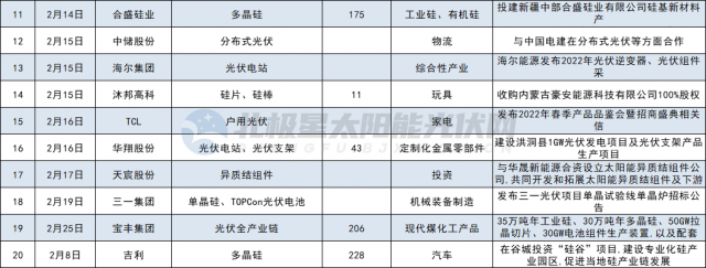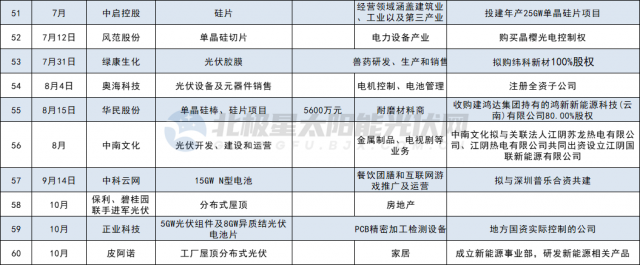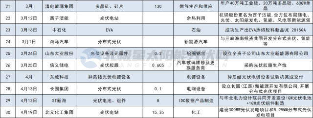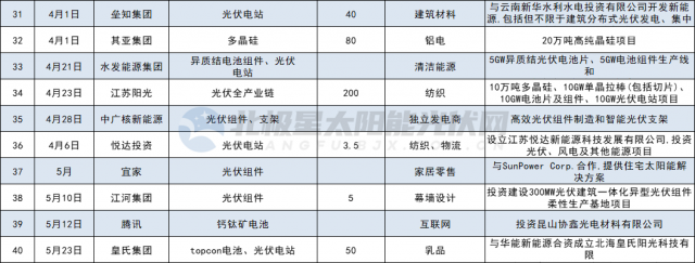 其他如多晶硅、硅片制造領(lǐng)域投資共7家,分別為合盛硅業(yè)、吉利、其亞集團、清電能源、中啟控股、風(fēng)范股份、華民股份。光伏設(shè)備5家,分別為山東大業(yè)股份、東威科技、拓普集團、奧??萍?、金鴻順。光伏膠膜3家,分別為中石化、信義儲電、綠康生化;此外,江蘇陽光、寶豐大手筆投資全產(chǎn)業(yè)鏈。