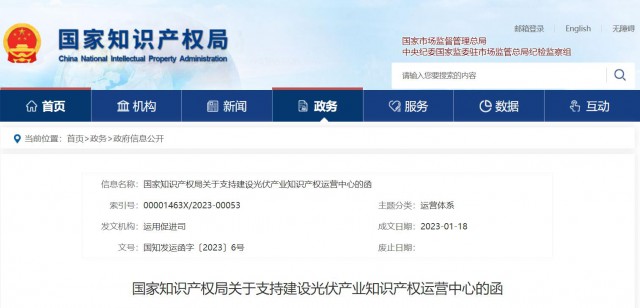 《關(guān)于申請(qǐng)支持北京晶澳太陽能光伏科技有限公司建設(shè)光伏產(chǎn)業(yè)知識(shí)產(chǎn)權(quán)運(yùn)營中心的請(qǐng)示》(京知局〔2022〕163號(hào))收悉。光伏產(chǎn)業(yè)是典型的國家戰(zhàn)略性新興產(chǎn)業(yè),發(fā)展光伏產(chǎn)業(yè)是實(shí)現(xiàn)我國“雙碳”目標(biāo)的重要途徑,對(duì)調(diào)整能源結(jié)構(gòu)、推進(jìn)能源生產(chǎn)和消費(fèi)方式變革、促進(jìn)生態(tài)文明建設(shè)具有重要戰(zhàn)略意義。我局支持北京晶澳太陽能光伏科技有限公司建設(shè)光伏產(chǎn)業(yè)知識(shí)產(chǎn)權(quán)運(yùn)營中心(以下簡稱運(yùn)營中心)。希望運(yùn)營中心緊密圍繞增強(qiáng)產(chǎn)業(yè)鏈供應(yīng)鏈穩(wěn)定性和競爭力,融合相關(guān)知識(shí)產(chǎn)權(quán)服務(wù)資源,著力培育知識(shí)產(chǎn)權(quán)運(yùn)營服務(wù)能力,促進(jìn)知識(shí)產(chǎn)權(quán)高質(zhì)量創(chuàng)造、高水平布局和高效益運(yùn)用,助推產(chǎn)業(yè)高質(zhì)量發(fā)展。