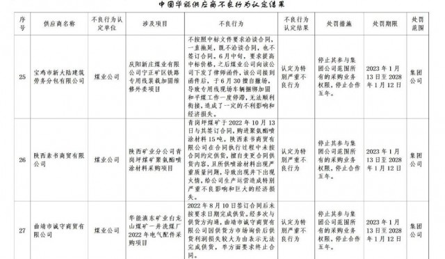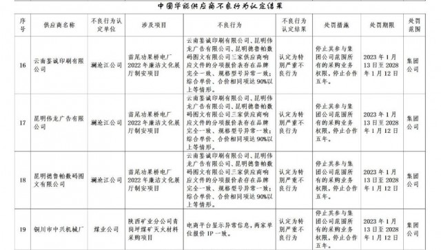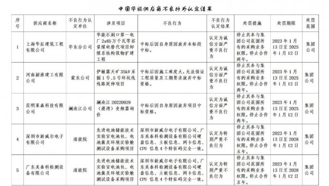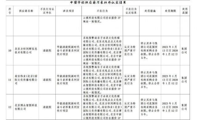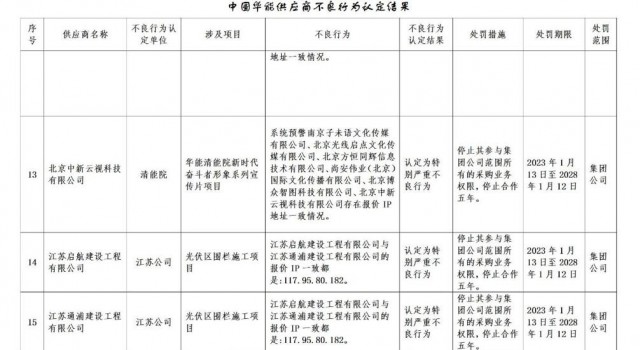 公告稱:為促進誠信履約,保證供應(yīng)商產(chǎn)品質(zhì)量、服務(wù)水平,依據(jù)《中國華能集團有限公司供應(yīng)商管理辦法》的有關(guān)規(guī)定,對發(fā)生誠信方面問題的供應(yīng)商進行了處理。