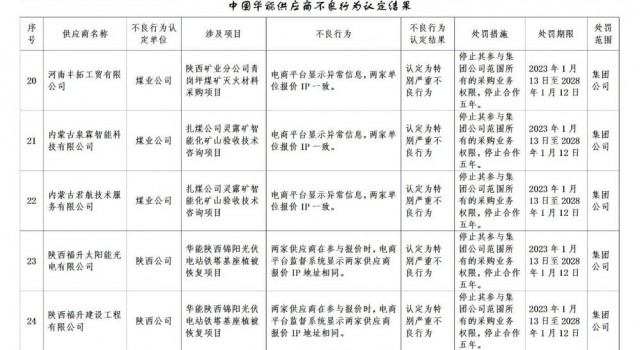 1月30日,華能集團發(fā)布《關(guān)于供應(yīng)商不良行為處理的公告》,共處罰27家企業(yè)。其中包括3家光伏相關(guān)公司。