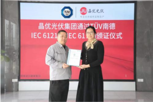 晶優(yōu)光伏集團(tuán)專注光伏組件定制生產(chǎn),致力于向客戶提供從高效光伏組件產(chǎn)品定制化到生產(chǎn)服務(wù)。TÜV南德針對晶優(yōu)光伏集團(tuán)的單玻和雙玻182/210光伏組件做了IEC 61215、IEC 61730全序列測試,整個測試周期該182、210光伏組件表現(xiàn)良好,最終通過TÜV南德檢測并收獲TÜV南德認(rèn)證證書。TÜV南德認(rèn)證證書的收獲是對晶優(yōu)光伏集團(tuán)該款光伏產(chǎn)品設(shè)計(jì)和工廠質(zhì)量保證的雙重認(rèn)可,有力證明了其產(chǎn)品的穩(wěn)定性及可靠性,確保為全球客戶交付高質(zhì)高效的光伏組件。
