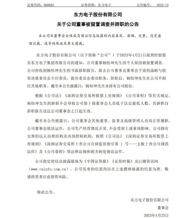 東方電子集團(tuán)所屬上市公司東方電子4月23日晚間公告稱,公司董事楊恒坤先生因個人原因被留置調(diào)查。