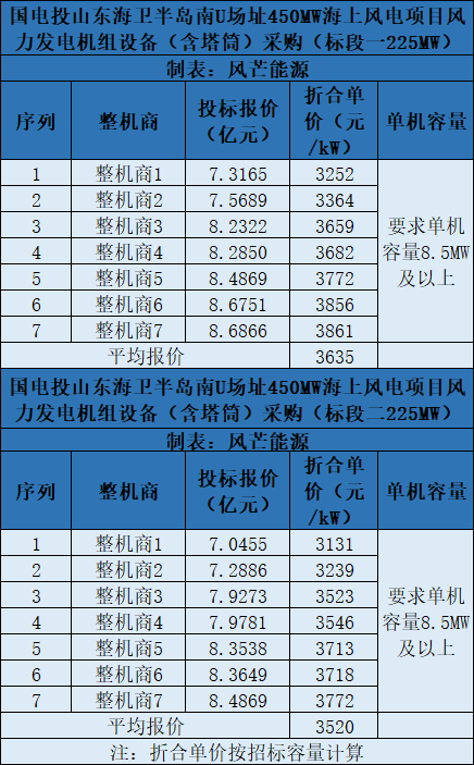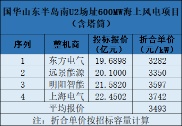 上次行業(yè)刷新低價是在國家能源集團國華投資山東半島南U2場址600MW海上風機(含塔筒)采購項目。該項目共有4家整機商競標,其中東方電氣報價最低,投標報價為19.69億元,折合單價為3282元/kW。