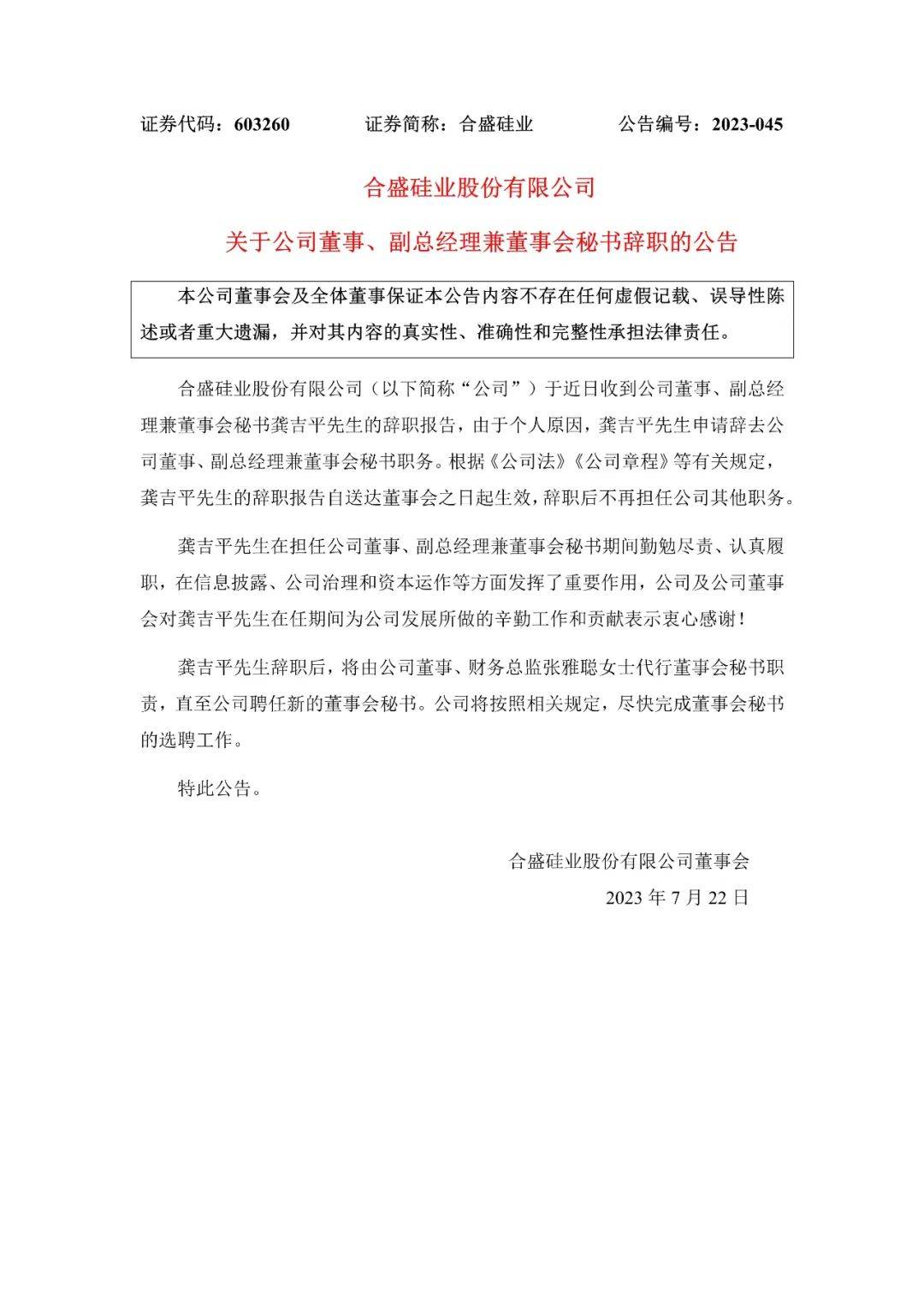 合盛硅業(yè)7月22日發(fā)布公告稱,由于個人原因,龔吉平申請辭去公司董事、副總經理兼董事會秘書職務。