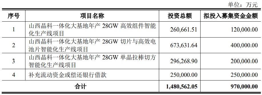 晶科能源向特定對象發(fā)行股票募集資金總額不超過970,000.00萬元(含本數(shù)),扣除相關(guān)發(fā)行費(fèi)用后的募集資金凈額,擬用于山西晶科一體化大基地年產(chǎn)28GW高效組件智能化生產(chǎn)線項(xiàng)目、山西晶科一體化大基地年產(chǎn)28GW切片與高效電池片智能化生產(chǎn)線項(xiàng)目、山西晶科一體化大基地年產(chǎn)28GW單晶拉棒切方智能化生產(chǎn)線項(xiàng)目、補(bǔ)充流動(dòng)資金或償還銀行借款。