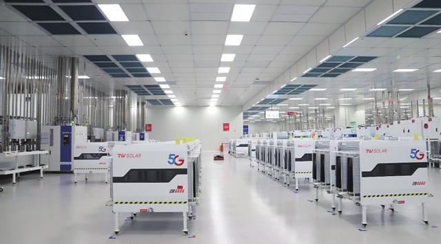 此外,通威還打造全球光伏行業(yè)首個(gè)5G智慧園區(qū)——通威太陽(yáng)能成都金堂基地?;貎?nèi)擁有11個(gè)足球場(chǎng)大小的無(wú)塵車間,32條全自動(dòng)智能制造生產(chǎn)線高效運(yùn)轉(zhuǎn),數(shù)百臺(tái)智能小車來(lái)回穿梭運(yùn)送物料,經(jīng)過(guò)制絨、擴(kuò)散、SE激光摻雜等10道工序,每天生產(chǎn)500多萬(wàn)片太陽(yáng)能電池片。這里的智能制造生產(chǎn)線,與同等產(chǎn)能的傳統(tǒng)太陽(yáng)能電池片生產(chǎn)線相比,用工減少約62%,能源消耗降低約30%,生產(chǎn)效率提升約161%。