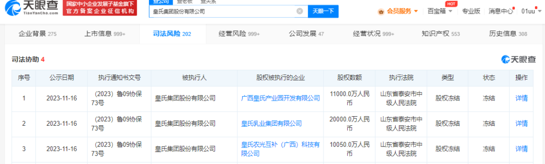 據(jù)天眼查App顯示,近日,皇氏集團新增3則股權(quán)凍結(jié)信息,被凍結(jié)股權(quán)數(shù)額合計約4.1億人民幣,股權(quán)被執(zhí)行企業(yè)為廣西皇氏產(chǎn)業(yè)園開發(fā)有限公司、皇氏乳業(yè)集團有限公司、皇氏農(nóng)光互補(廣西)科技有限公司,凍結(jié)期限自2023年11月16日至2026年11月15日。