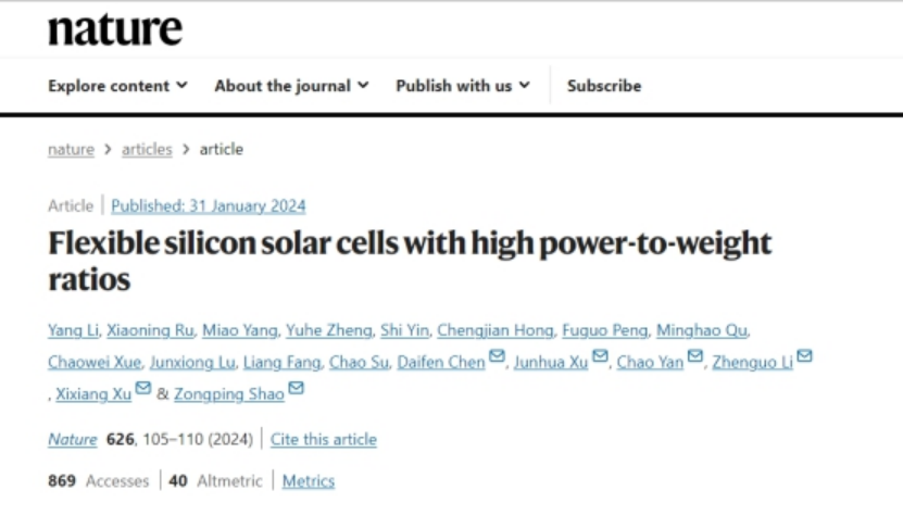 近日,隆基綠能與江蘇科技大學(xué)、澳大利亞科廷大學(xué)三方合作,在國際上首次制造出高柔韌性、高功率重量比的晶硅異質(zhì)結(jié)太陽能電池,相關(guān)研究成果以“Flexible silicon solar cells with high power-to-weight ratios”為題發(fā)表在國際期刊《Nature》(自然)上。