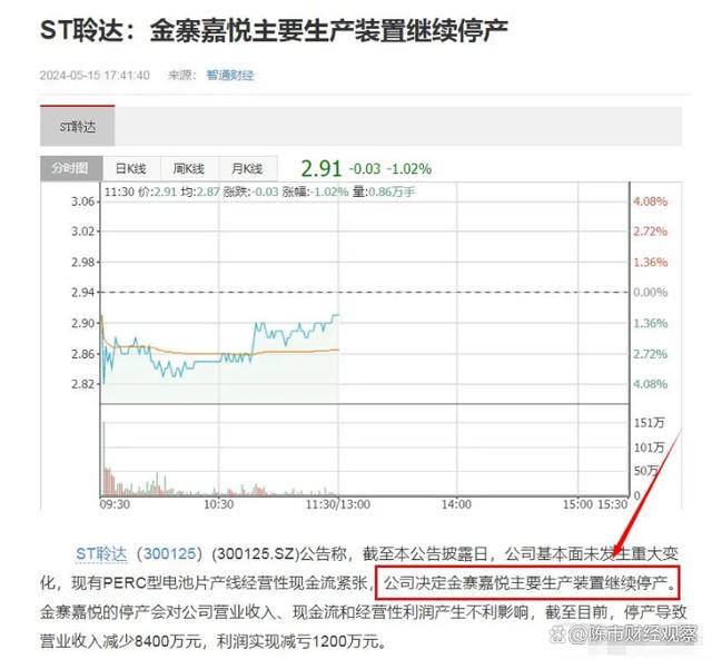 據(jù)業(yè)內(nèi)消息顯示,ST聆達(dá)股份(300125)日前發(fā)布公告,稱由于公司基本面未發(fā)生重大變化,現(xiàn)有PERC型電池片產(chǎn)線經(jīng)營性現(xiàn)金流緊張?;诖耍鲞_(dá)股份宣布旗下的光伏制造工廠-金寨嘉悅繼續(xù)保持停產(chǎn)狀態(tài),但具體的復(fù)工時間并未確定。值得一提的是,今年2月份,金寨嘉悅就因為市場等因素而宣布于3月5日開始放假,并預(yù)計今年6月1日復(fù)工。然而,在預(yù)計的復(fù)工日期臨近之際,金寨嘉悅被宣布繼續(xù)停產(chǎn)。業(yè)內(nèi)人士認(rèn)為,此次宣布繼續(xù)放假,預(yù)示著這家光伏大廠正面臨前所未有的困難,短期內(nèi)復(fù)工或是無望。