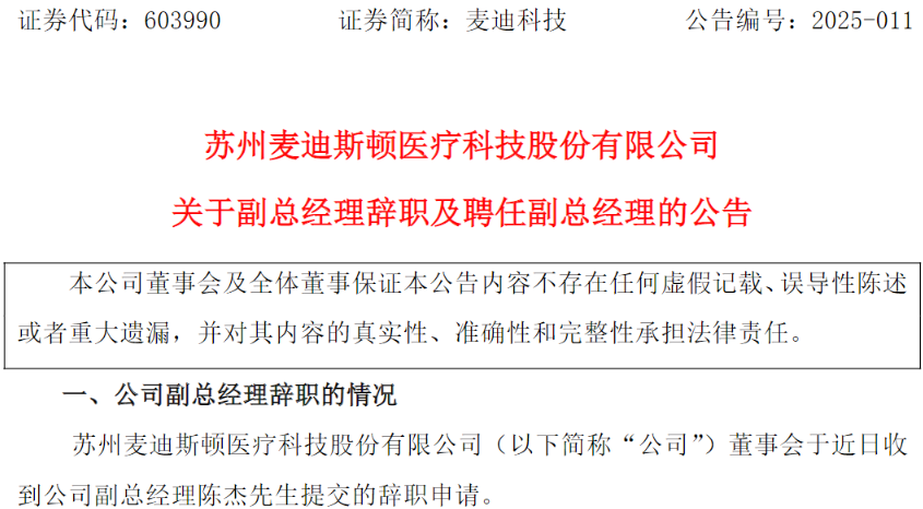 1月27日下午,麥迪科技(603990)發(fā)布公告稱,該公司董事會于近日收到公司副總經理陳杰提交的辭職申請。