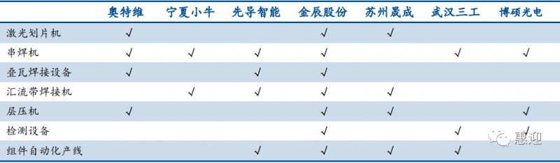 組件設(shè)備的市場較為分散,公司數(shù)量較多,競爭較為充分。組件設(shè)備國產(chǎn)化進(jìn)程較早,廠商可提供多種產(chǎn)品,充分利用技術(shù)同源和客戶同源優(yōu)勢。如奧特維可提供激光劃片機(jī)、串焊機(jī)、疊瓦串焊機(jī)、層壓機(jī)等設(shè)備,先導(dǎo)智能可提供串焊機(jī)、疊瓦一體焊接機(jī)、匯流條焊接機(jī)等設(shè)備,金辰股份可提供激光劃片機(jī)、串焊機(jī)、疊片焊接機(jī)、層壓機(jī)、匯流條焊接機(jī)、層壓機(jī)、EL 測試儀等設(shè)備。同時(shí),先導(dǎo)智能、金辰股份、蘇州晟成、武漢三工還可提供組件自動化生產(chǎn)線。