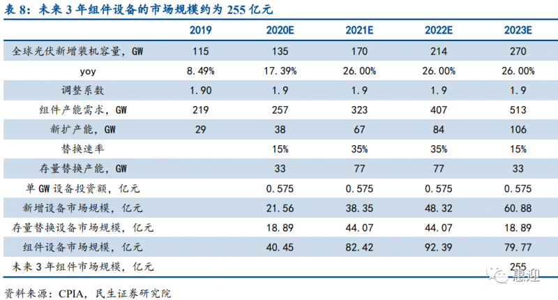 經(jīng)民生證券測算,預(yù)計(jì) 2021 年、2022 年、2023 年組件設(shè)備的市場規(guī)??煞謩e達(dá)到 82.42 億元、92.39 億元和 79.77 億元,未來 3 年組件設(shè)備的市場規(guī)模合計(jì)可達(dá) 255 億元,組件設(shè)備廠商擁有廣闊的發(fā)展前景。
