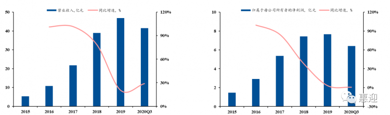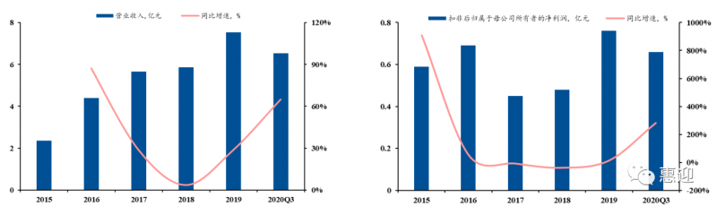 公司是光伏自動化組件設(shè)備的頭部供應(yīng)商,下游客戶涵蓋國內(nèi)多家知名光伏組件企業(yè),同時(shí)積極布局新型組件設(shè)備,向壁壘較高的電池設(shè)備領(lǐng)域延伸,探索新增長點(diǎn)。2015-2019 年,公司業(yè)績大幅增長,營業(yè)收入從 2.92 億元增長至 7.9 億元,CAGR 為 31.08%。截止 2020 年第三季度,公司的歸母凈利潤為 0.65 億元,同比增長 65%,超過 2019 年全年歸母凈利潤。合同負(fù)債已達(dá) 3.71 億元,為 2021 年業(yè)績奠定良好基礎(chǔ)。2019 年,光伏組件自動化生產(chǎn)線作為公司的主營業(yè)務(wù),占總營收的 93.11%,輔之以串焊機(jī)、層壓機(jī)等價(jià)值量較高的單機(jī)設(shè)備。