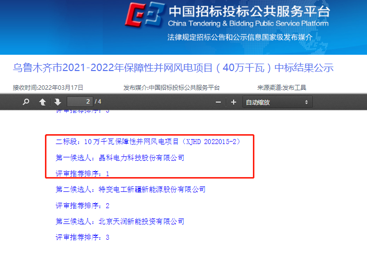 近日,烏魯木齊市2021-2022年保障性并網(wǎng)風(fēng)電項(xiàng)目(40萬(wàn)千瓦)中標(biāo)結(jié)果公示,晶科科技(601778.SH)憑借領(lǐng)先的技術(shù)及良好的行業(yè)口碑,中標(biāo)了其中10萬(wàn)千瓦(100MW)規(guī)模的保障性并網(wǎng)風(fēng)電項(xiàng)目。此次中標(biāo),是晶科科技成立以來(lái)首次獲得風(fēng)電項(xiàng)目,也是公司推動(dòng)可再生、清潔能源開(kāi)發(fā)利用之路上新的里程碑,標(biāo)志著公司正式進(jìn)軍風(fēng)電市場(chǎng)。