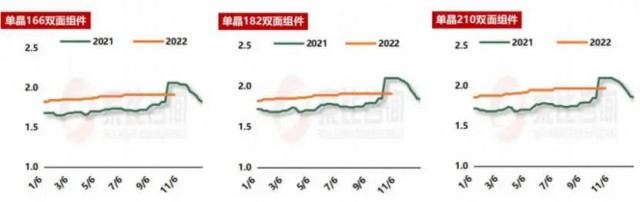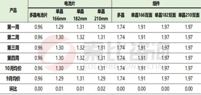 根據(jù)索比咨詢對多家組件制造商的調(diào)研:就10月組件價格行情來看,單晶166雙面均價1.91元/W,較9月環(huán)比持平;單晶182雙面均價1.97元/W,較9月環(huán)比持平;單晶210雙面均價1.97元/W,較9月環(huán)比持平。