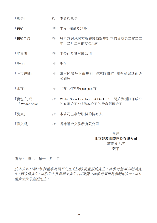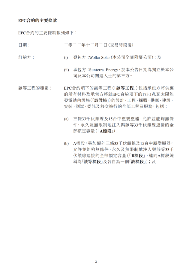 12月2日,北京能源國際發(fā)布公告稱,于2022年12月2日公司全資附屬公司W(wǎng)ollar Solar,作為發(fā)包方與承包方Sunterra Energy訂立EPC合約。