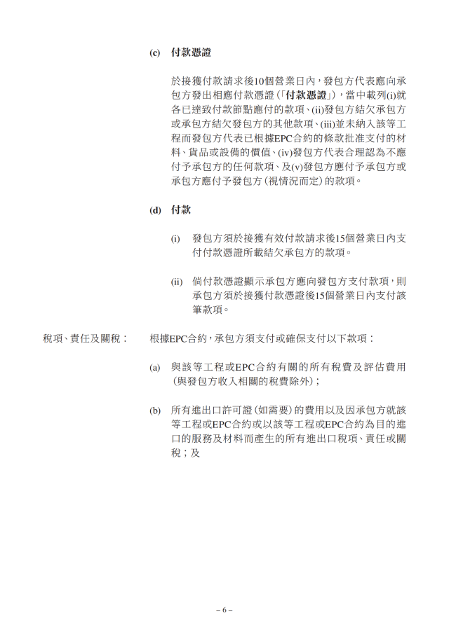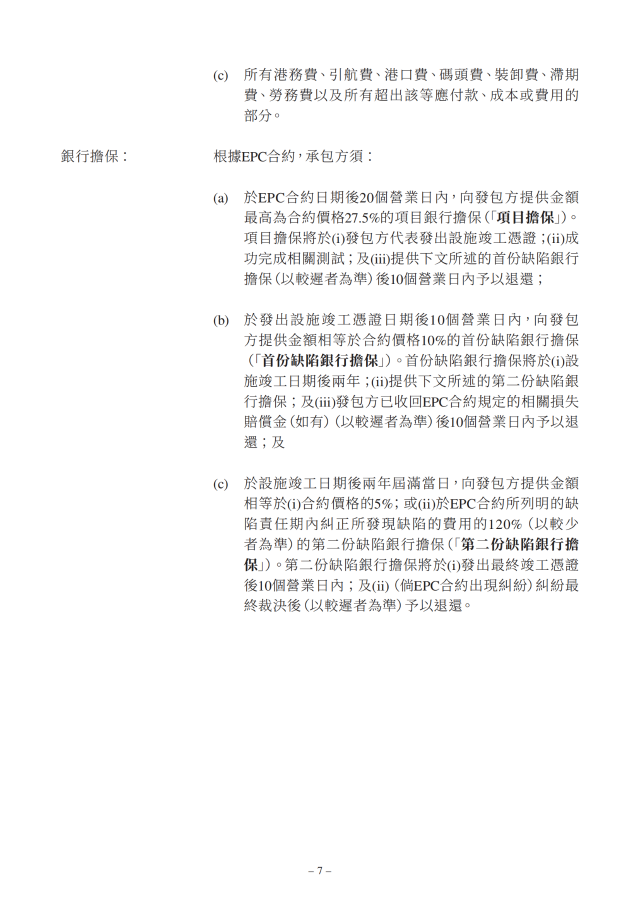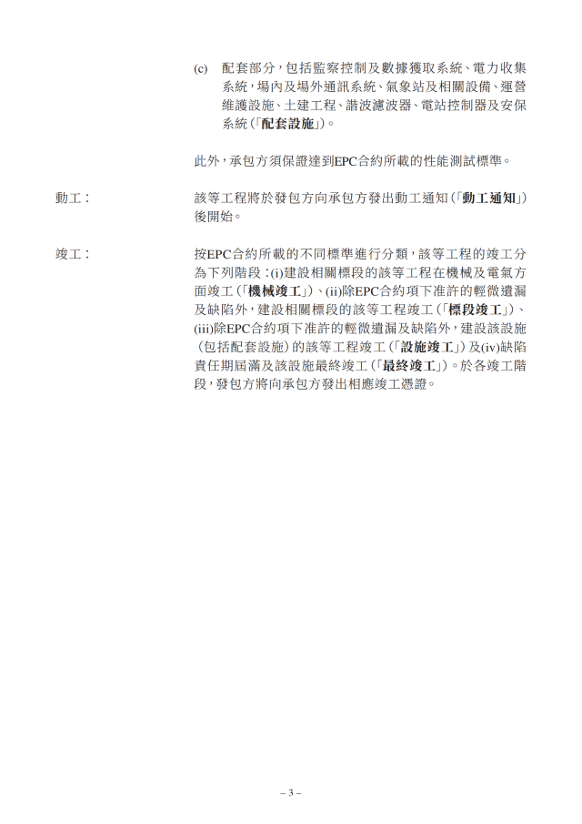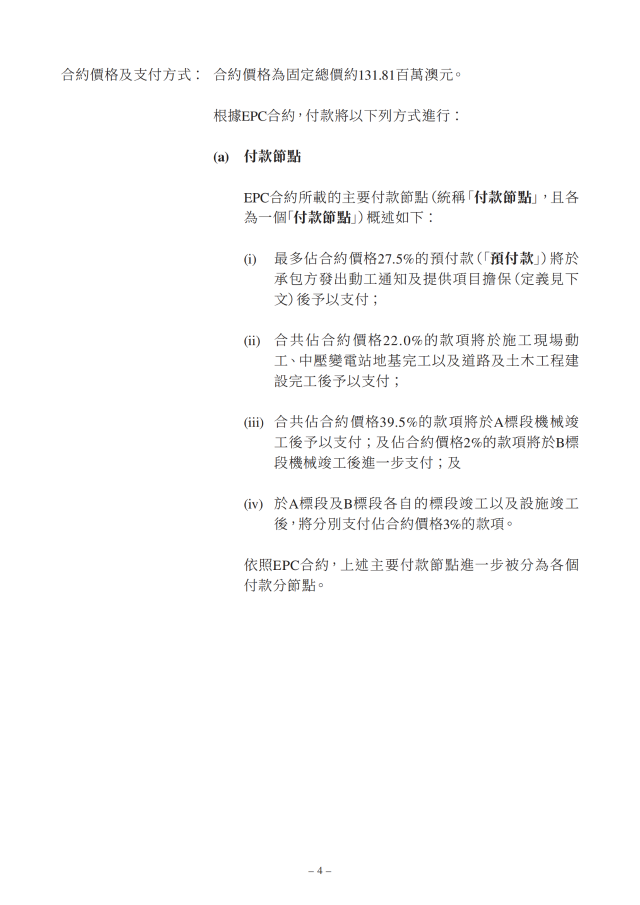 此EPC合約的合約價格約為1.32億澳元,當(dāng)前匯率折算約合6.17億元人民幣,設(shè)施為EPC合約項(xiàng)下的173.1兆瓦太陽能發(fā)電站內(nèi)設(shè)施的設(shè)計(jì)、工程、采購、供應(yīng)、建設(shè)、安裝、測試、委托及移交進(jìn)行的全部工程及服務(wù)。