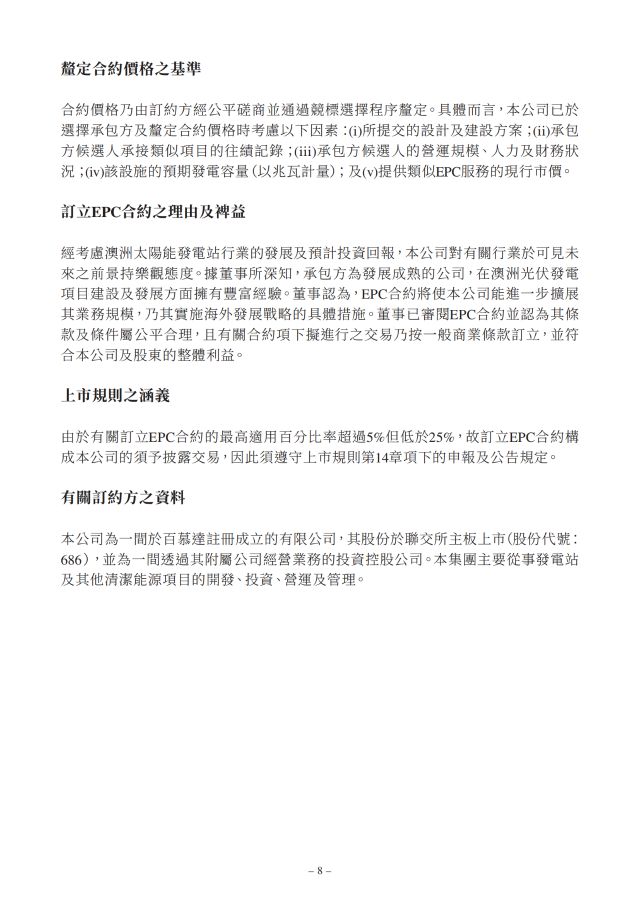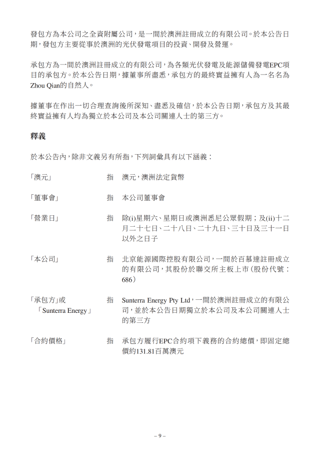 北京能源國際在公告中表示,經(jīng)考慮澳洲太陽能發(fā)電站行業(yè)的發(fā)展及預(yù)計(jì)投資回報(bào),公司對有關(guān)行業(yè)于可見未來的前景持樂觀態(tài)度。據(jù)董事所深知,承包方為發(fā)展成熟的公司,在澳洲光伏發(fā)電項(xiàng)目建設(shè)及發(fā)展方面擁有豐富經(jīng)驗(yàn)。董事認(rèn)為,EPC合約將使公司能進(jìn)一步擴(kuò)展其業(yè)務(wù)規(guī)模,乃其實(shí)施海外發(fā)展戰(zhàn)略的具體措施。董事已審閱EPC合約并認(rèn)為其條款及條件屬公平合理,且有關(guān)合約項(xiàng)下擬進(jìn)行的交易乃按一般商業(yè)條款訂立,并符合公司及股東的整體利益。