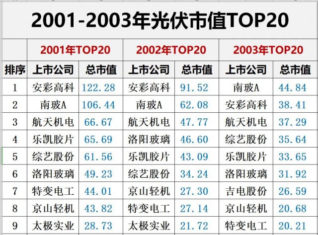 2001年,資本市場上只有約10家光伏上市公司,他們總市值合計為590億元,其中很多企業(yè)光伏業(yè)務占比都很小,都還算不上真正的光伏企業(yè)。
