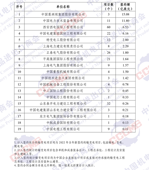2022年中國(guó)企業(yè)境外輸變電項(xiàng)目簽約額排名