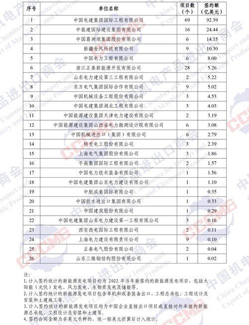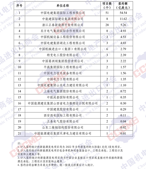 日前,中國(guó)機(jī)電產(chǎn)品進(jìn)出口商會(huì)發(fā)布2022年境外電力項(xiàng)目簽約排行榜。根據(jù)中國(guó)機(jī)電商會(huì)統(tǒng)計(jì),2022年,中國(guó)企業(yè)參與境外電力項(xiàng)目投(議)標(biāo)并最終實(shí)現(xiàn)簽約的項(xiàng)目517個(gè),簽約合同總金額339.93億美元,總裝機(jī)容量約33.5GW。根據(jù)各重點(diǎn)企業(yè)報(bào)送的2022年境外電力項(xiàng)目的新簽約情況,中國(guó)機(jī)電商會(huì)對(duì)企業(yè)簽約額進(jìn)行了排名?,F(xiàn)將企業(yè)排名及火電、水電、輸變電、新能源(太陽(yáng)能、風(fēng)、生物質(zhì)、儲(chǔ)能等)及太陽(yáng)能(光伏)、風(fēng)電行業(yè)簽約排名予以發(fā)布。