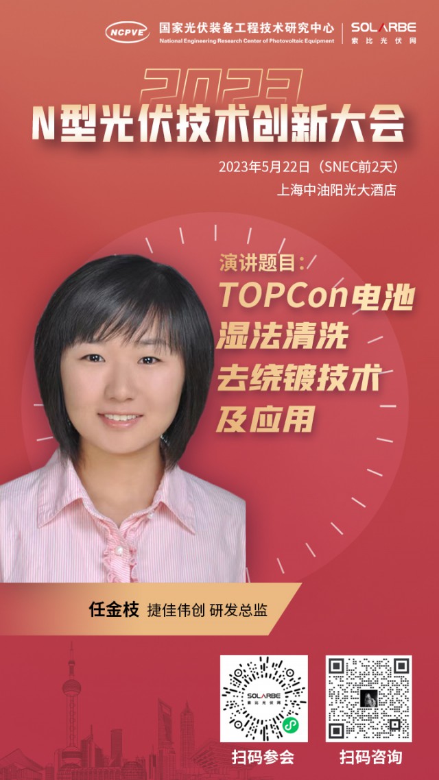 5月22日,捷佳偉創(chuàng)受邀參加2023年首屆N型光伏技術(shù)創(chuàng)新大會(huì),公司研發(fā)總監(jiān)任金枝將發(fā)表題為“TOPCon電池濕法清洗去繞鍍技術(shù)及應(yīng)用”的主題演講,與晶科能源、湖南紅太陽(yáng)、帝爾激光等多家企業(yè)探討TOPCon電池量產(chǎn)降本增效的解決方案。