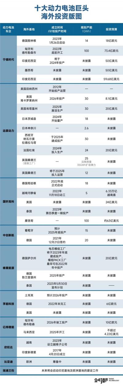 動(dòng)力電池企業(yè)方面,據(jù)24潮團(tuán)隊(duì)不完全統(tǒng)計(jì),截至目前,國(guó)內(nèi)已有寧德時(shí)代、遠(yuǎn)景動(dòng)力、國(guó)軒高科、中創(chuàng)新航、蜂巢能源、孚能科技、億緯鋰能、欣旺達(dá)等10家動(dòng)力電池巨頭計(jì)劃或者已在海外有深度的產(chǎn)業(yè)布局,其公開(kāi)對(duì)外披露的/媒體公開(kāi)報(bào)道的項(xiàng)目達(dá)33個(gè),總投資預(yù)算超4000億元。
