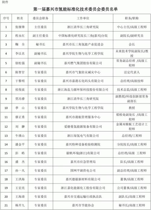 附件:第一屆嘉興市氫能標(biāo)準(zhǔn)化技術(shù)委員會委員名單