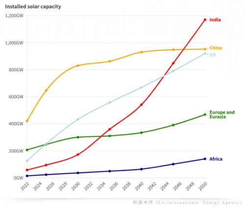 近年來,印度光伏市場(chǎng)發(fā)展迅速,光伏裝機(jī)始終保強(qiáng)勁增長(zhǎng)。截至2023年6月30日,印度可再生能源發(fā)電的累計(jì)裝機(jī)容量達(dá)到129.6GW,太陽能約占可再生能源總裝機(jī)容量的54%。美國(guó)能源信息署(IEA) 《國(guó)際能源展望》報(bào)告預(yù)測(cè)稱,至2050年,印度的太陽能裝機(jī)容量將在全球占據(jù)主導(dǎo)地位。