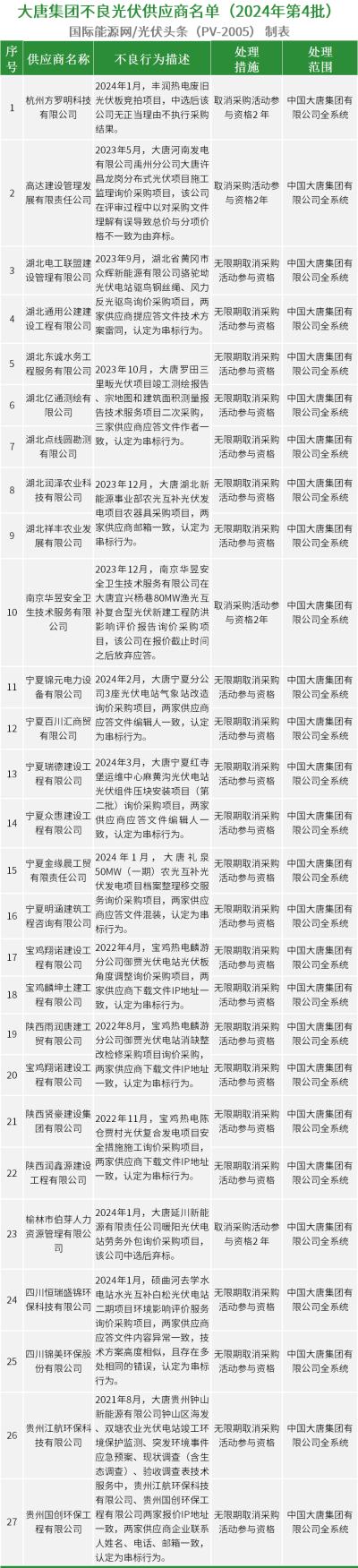 此次共有27家企業(yè)與光伏行業(yè)相關(guān),共涉及15個項目。其中,有23家企業(yè)被處罰原因為存在串標(biāo)行為,處理措施為無限期取消采購活動參與資格,處理范圍為中國大唐集團(tuán)有限公司全系統(tǒng)。4家企業(yè)被處罰原因為中選后無正當(dāng)理由不執(zhí)行采購結(jié)果、在評審過程中以對采購文件理解有誤導(dǎo)致總價與分項價格不一致為由棄標(biāo)、在報價截止時間之后放棄應(yīng)答、中選后棄標(biāo),處理措施為取消采購活動參與資格2年,處理范圍為中國大唐集團(tuán)有限公司全系統(tǒng)。