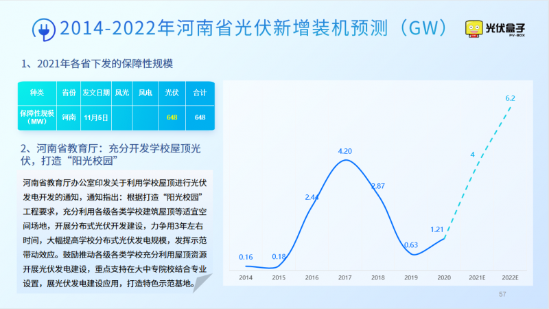 2021年11月5日河南省下發(fā)光伏保障性建設(shè)規(guī)模指標共648MW。同時,河南省教育廳提出打造“陽光校園”工程,要求充分利用各級各類學校建筑屋頂?shù)冗m宜空間場地,開展分布式光伏開發(fā)建設(shè),力爭用3年左右時間,大幅提高學校分布式光伏發(fā)電規(guī)模。鼓勵推動各級各類學校充分利用屋頂資源開展光伏發(fā)電建設(shè),打造特色示范基地。