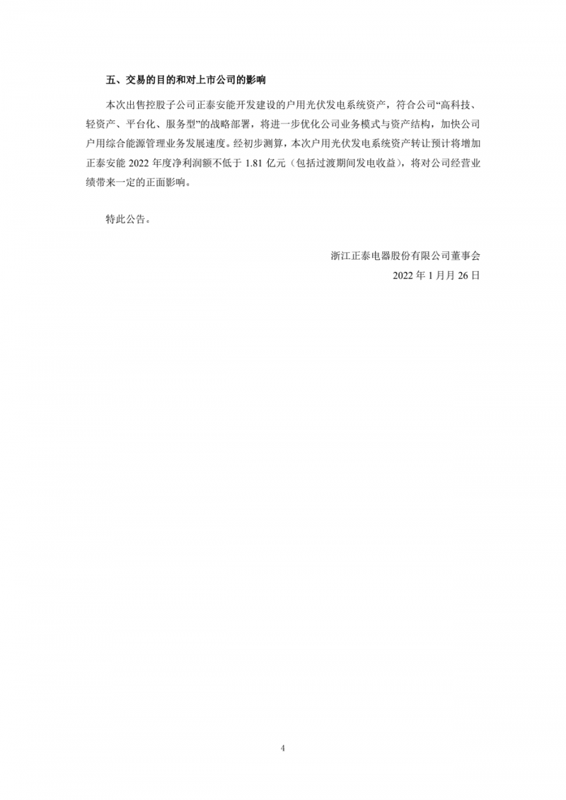 正泰電器認(rèn)為,本次出售控股子公司正泰安能開發(fā)建設(shè)的戶用光伏發(fā)電系統(tǒng)資產(chǎn),符合公司“高科技、輕資產(chǎn)、平臺(tái)化、服務(wù)型”的戰(zhàn)略部署,將進(jìn)一步優(yōu)化公司業(yè)務(wù)模式與資產(chǎn)結(jié)構(gòu),加快公司戶用綜合能源管理業(yè)務(wù)發(fā)展速度。經(jīng)初步測算,本次戶用光伏發(fā)電系統(tǒng)資產(chǎn)轉(zhuǎn)讓預(yù)計(jì)將增加正泰安能2022年度凈利潤額不低于1.81億元(包括過渡期間發(fā)電收益),將對(duì)公司經(jīng)營業(yè)績帶來一定的正面影響。