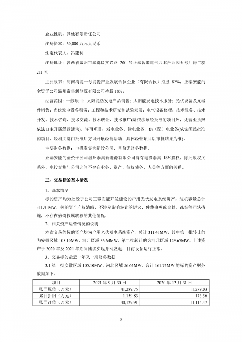 根據(jù)交易公告,正泰安能與電投泰集簽訂資產(chǎn)收購協(xié)議,將其所持有的河北及安徽區(qū)域總計(jì)311.41MW戶用光伏發(fā)電系統(tǒng)資產(chǎn)分兩批轉(zhuǎn)讓給電投泰集,交易對(duì)價(jià)總計(jì)為124749.41萬元(均為含稅價(jià),增值稅稅率13%);其中第一批轉(zhuǎn)讓安徽區(qū)域 105.10MW、河北區(qū)域56.64MW,合計(jì)161.74MW,交易對(duì)價(jià)為65281.91萬元(含稅價(jià),增值稅稅率13%);第二批轉(zhuǎn)讓河北區(qū)域149.67MW,交易對(duì)價(jià)為59467.50萬元(含稅價(jià),增值稅稅率13%)。上述資產(chǎn)交割完成后,正泰安能或其子公司將繼續(xù)為上述戶用光伏發(fā)電系統(tǒng)提供運(yùn)維服務(wù)。