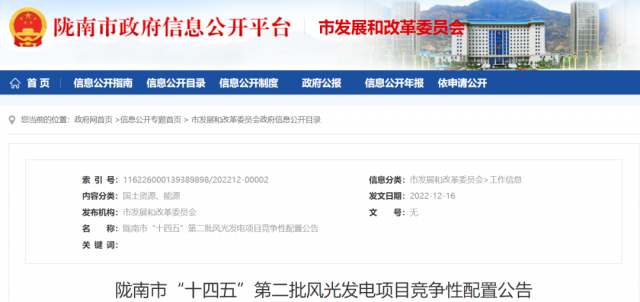 12月16日,隴南市發(fā)布“十四五”第二批風(fēng)光發(fā)電項(xiàng)目競爭性配置公告。