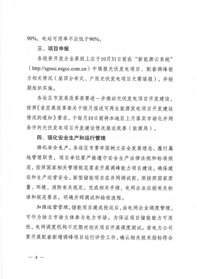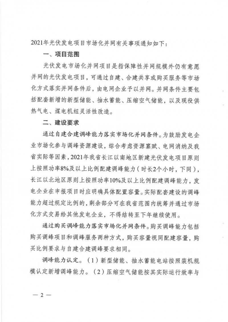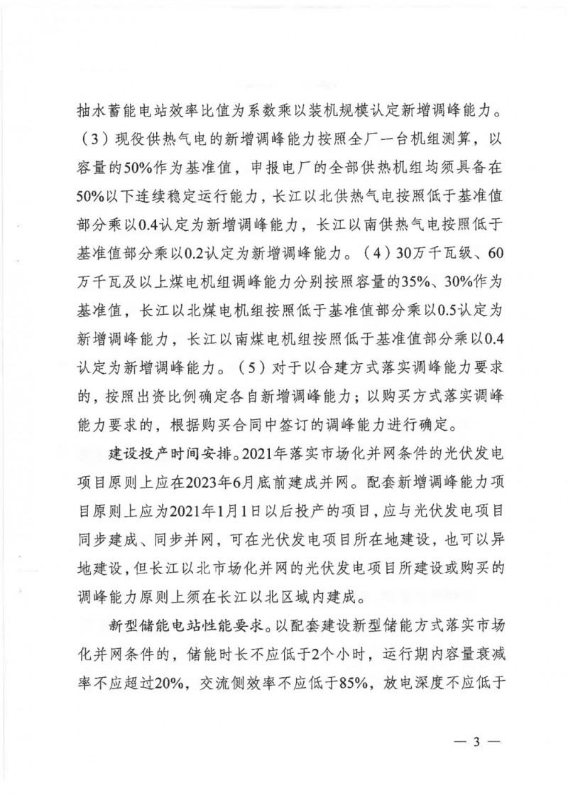 2021年落實(shí)市場(chǎng)化并網(wǎng)條件的光伏發(fā)電項(xiàng)目:原則上應(yīng)在2023年6月底前建成并網(wǎng)。配套新增調(diào)峰能力項(xiàng)目原則上應(yīng)為2021年1月1日以后投產(chǎn)的項(xiàng)目,應(yīng)與光伏發(fā)電項(xiàng)目同步建成、同步并網(wǎng),可在光伏發(fā)電項(xiàng)目所在地建設(shè),也可以異地建設(shè),但長(zhǎng)江以北市場(chǎng)化并網(wǎng)的光伏發(fā)電項(xiàng)目所建設(shè)或購(gòu)買(mǎi)的調(diào)峰能力原則上須在長(zhǎng)江以北區(qū)域建成。