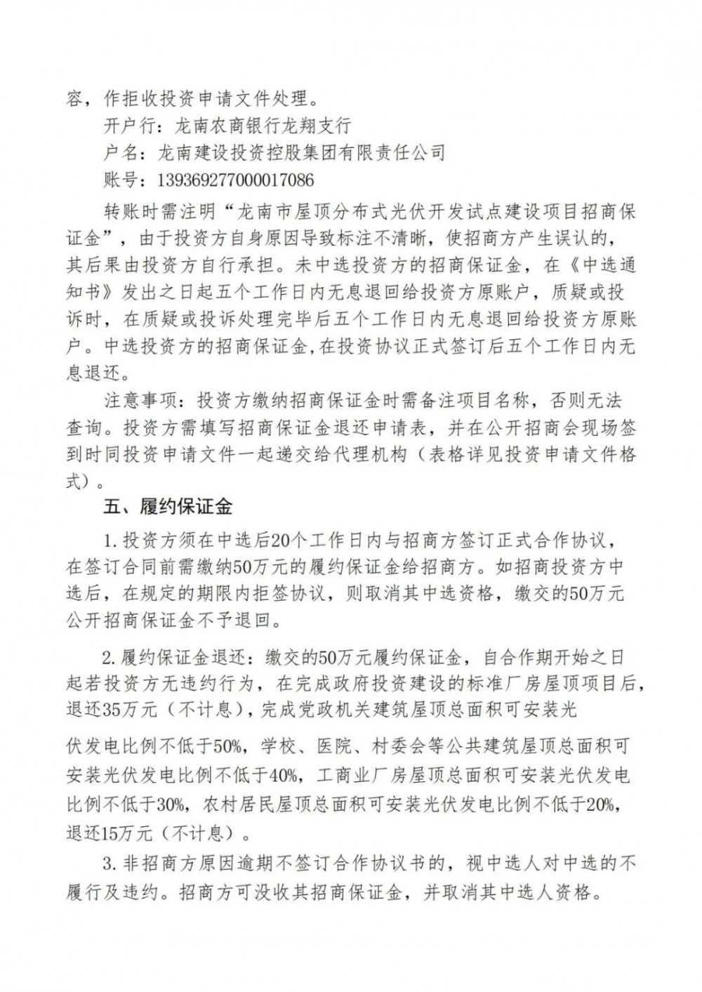 根據(jù)公告,本次招商項目總投資約20億元,首期投資約3億元。建設(shè)內(nèi)容為龍南市內(nèi)黨政機關(guān)、學(xué)校、醫(yī)院、村委會、工業(yè)園區(qū)廠房和農(nóng)村房屋屋頂光伏開發(fā)。通過招商方式引進投資方負責(zé)項目建設(shè)及運營。龍南建設(shè)投資控股集團有限責(zé)任公司將可以建設(shè)光伏電站的所有屋頂以租賃方式租賃給投資方建設(shè)分布式光伏電站,若招商方需要則共同投資,另行約定。投資方負責(zé)項目全部投資,包含但不限于建設(shè)期間的設(shè)計、設(shè)備采購、安裝、調(diào)試、驗收等費用以及運營期間的管理、維護等費用。