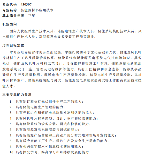 在中等職業(yè)教育中,包括光伏工程技術與應用專業(yè)、太陽能與沼氣技術利用兩個專業(yè)。高等職業(yè)教育??茖I(yè)中,包括光伏工程技術、新能源材料應用技術兩個專業(yè)。高等職業(yè)教育本科專業(yè)中僅有新能源材料應用技術一個相關專業(yè)。
